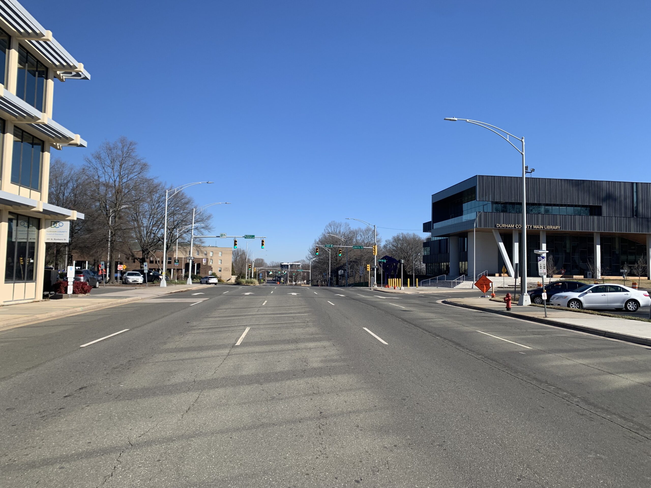 Not rush hour on Roxboro Street, but not far from it, either. The road is hilariously over-sized near downtown: